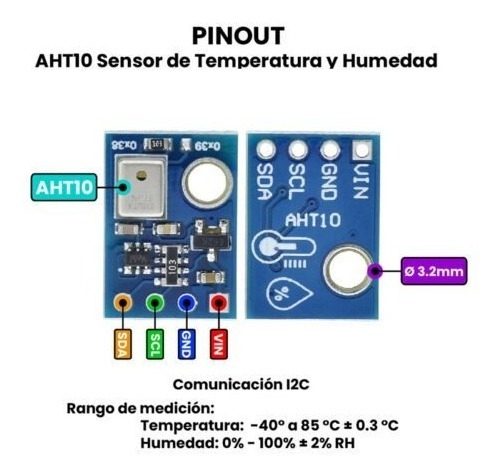 AHT10 es un sensor que brinda lecturas de temperatura y humedad con bajo costo y alto rendimiento. Este sensor es versátil, pudiendo reemplazar a los sensores DHT11, SHT20 y AM2302, gracias a su estabilidad en ambientes adversos. Ideal para aplicaciones de control automático de temperatura, aire acondicionado, estaciones meteorológicas, y regulación de humedad y temperatura en el hogar.