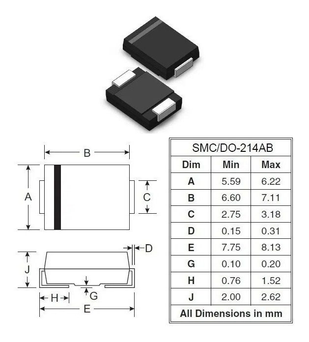 – Encapsulado: SMC / DO-214AB Tamaño de cápsula aproximado 6,9mm x 5,9mm
